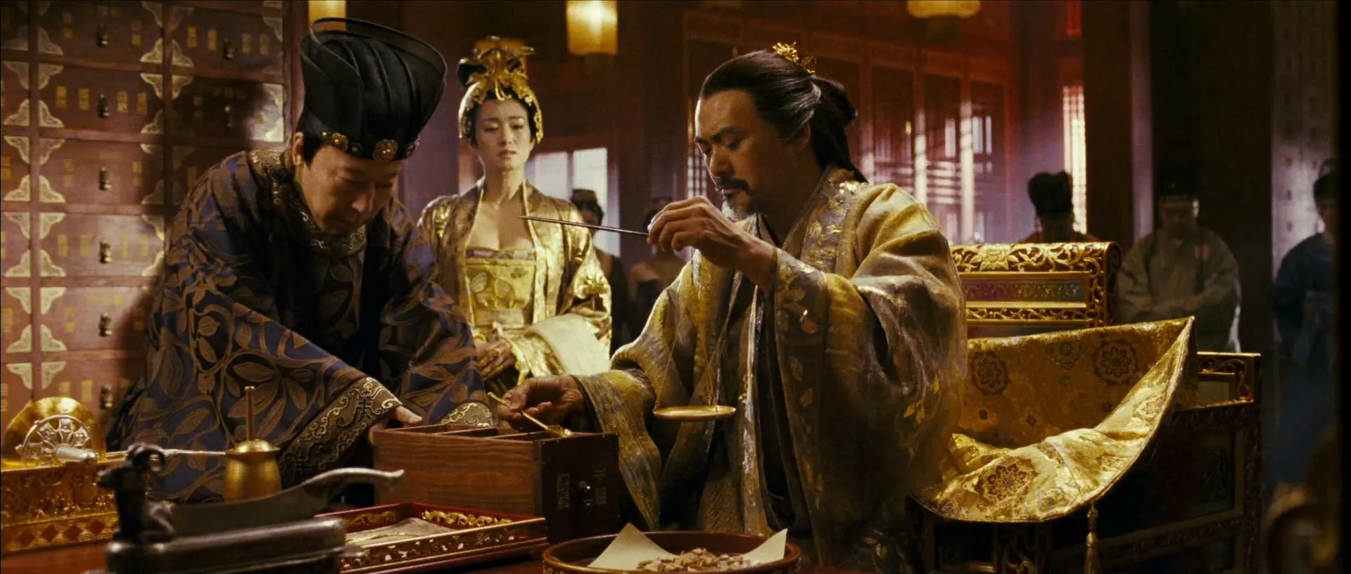 Cast: Chow Yun-fat as Emperor Ping, Gong Li as Empress Phoenix, Jay Chou as Prince Zhai, Liu Ye as Crown Prince Wan, Qin Junjie as Prince Yu, Li Man as Jiang Chan, Ni Da-Hong as Imperial Physician Jiang, Chen Jin as Imperial Physician's Wife, Siran Ge as Maid, Jiulong Guo as Host of The Festival, Li Ming as Senior Eunuch, Ma Tianyu as Medicine Boy, Feng Bai as Soldier